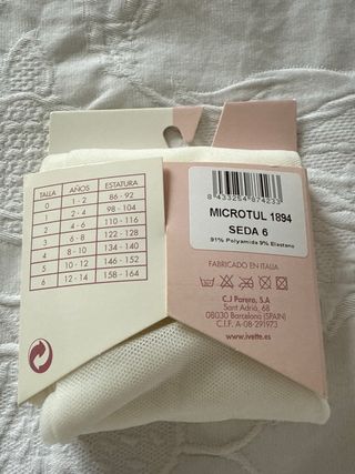 Panty niña Ivette, color blanco, talla 6 (12-14 años 158-164cm). Son de microfibra y seda, muy suaves. - Fabricadas en Italia. - 91% Poliamida, 9% Elastano. - 20 deniers. - Perfecto estado.