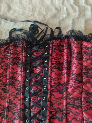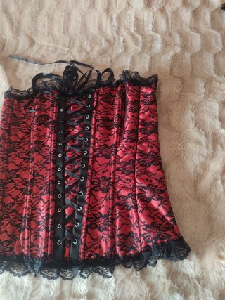 Vendo precioso corset de ballestas, color rojo y negro, cierre de cintas y cremallera lateral, a juego dos tangas, totalmente nuevo, sin uso.