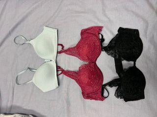 Conjunto de tres sujetadores de la marca Women'secret, talla 90B. El pack se vende a 7€ e individuales a 3€ - un sujetador de color azul claro con textura acanalada, de algodón y más gastado, aunque en muy buen estado. - Un sujetador de encaje en color rosa intenso poco usado y en muy buen estado. - Un sujetador de encaje en color negro poco usado y en muy buen estado.