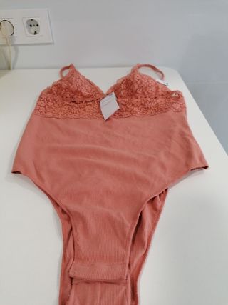 Body de encaje de Women'secret, color melocoton. Está en perfecto estado. - Talla: xl - Escote pico - Detalle de encaje en el pecho - Cazuelas en el pecho - Tejido suave y cómodo