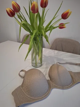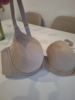 Sujetador color beis, con aros y foam. Tirantes regulables y doble fila de corchetes. Talla 105 copa C. Completamente nuevo y a Estrenar.