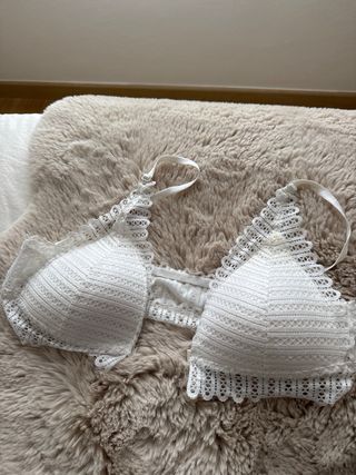 Sujetador de encaje blanco, sin aros y con un diseño delicado. - Tejido de encaje con detalles calados. - Tirantes ajustables. - Cierre frontal.