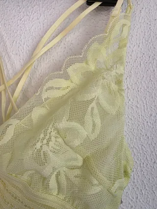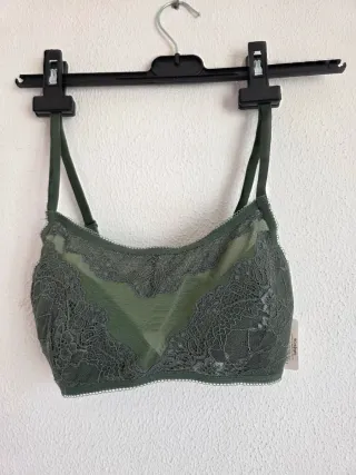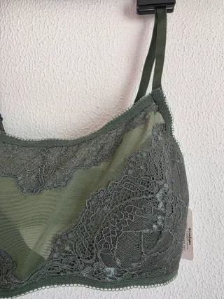 Bralette de encaje con un diseño delicado. Tengo 2 unidades, PRECIO POR UNIDAD. - Color verde oliva. - Talla 1.( puse 80B pero no sé a qué talla equivale, es talla 1, calculo que por ahí, es elástico pero menos que el amarillo de mi perfil) - Detalle de encaje en copas y banda. - Tirantes ajustables.