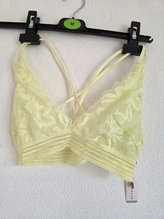 Bralette de encaje con un diseño delicado y tirantes cruzados. - Tejido de encaje floral. - Diseño de tirantes cruzados en la espalda. - Banda inferior elástica con detalles. - Talla 1 pero es muy muy elástico. Tengo dos unidades, PRECIO POR UNIDAD. QUEDAN FANTÁSTICOS.
