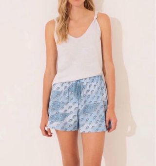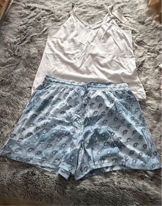 Conjunto de pijama de verano de Women'secret. - Camiseta de tirantes gris. - Pantalón corto con estampado paisley azul y blanco. - Cintura elástica con cordón.
