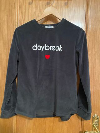 Pijama de manga larga con un diseño moderno y cómodo. - Tejido suave tipo terciopelo. - Estampado daybreak con corazón rojo. - Cuello redondo.