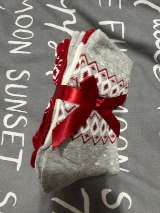 Conjunto de cinco pares de calcetines de invierno con un diseño festivo. - Diseño de rombos en rojo y blanco. - Combinación de colores gris, blanco y rojo. - Tejido suave y cálido.