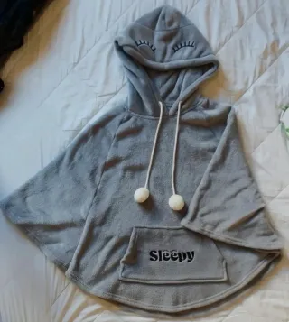 Pijama tipo poncho en color gris claro, confeccionada en tejido muy suave y calentito, ideal para estar en casa. Capucha con detalle de ojitos bordados, cordones con pompones y bolsillo delantero con la palabra “Sleepy” bordada. Diseño amplio y cómodo tipo poncho. Está en muy buen estado, sin manchas ni roturas. Talla S.