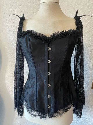 Elegante corsé negro con detalles de encaje y mangas largas. - Diseño con escote de volantes. - Cierre frontal con corchetes. - Mangas de encaje semitransparente. - Adorno de encaje en el bajo.