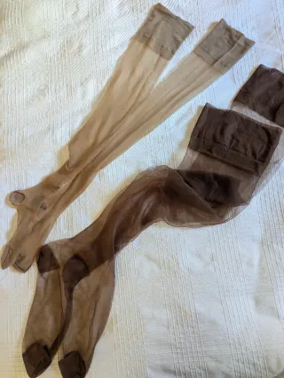 Conjunto de cuatro pares de medias de seda vintage. Ideal para hacer escaparates, cosplay, etc. Algun pequeño enganche.