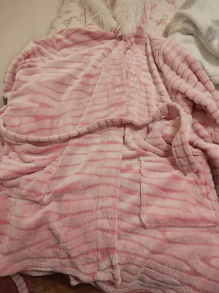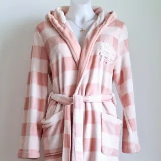 Bata de casa suave y cómoda con capucha. - Diseño a rayas rosas y blancas. - Forro interior de pelo sintético en la capucha.