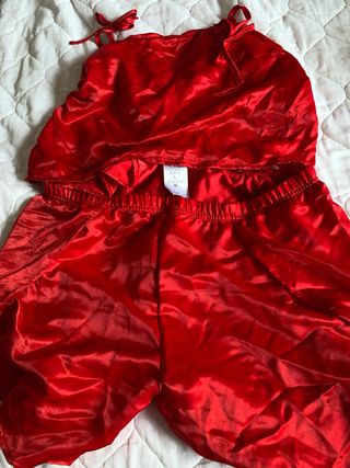 Conjunto de pijama de satén en color rojo, ideal para ocasiones especiales. - Tejido satinado brillante. - Talla XL.