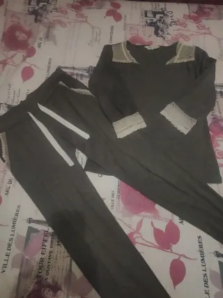 Conjunto de pijama de dos piezas gris oscuro con detalles de encaje en color crema. Pantalón largo. Manga 3/4. Marca Primark. Talla S.