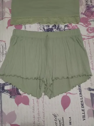 Conjunto de pijama de dos piezas en color verde clarito. Marca Primark. Talla S. Pantalón corto con cintura elástica y cordón. Top con encaje decorativo y doble tejido con ajuste para asegurar la zona del pecho. Tirantes ajustables.