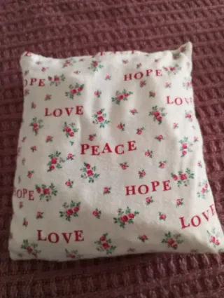 Conjunto de pijama cómodo y con un diseño alegre. - Pantalón blanco con estampado de flores rojas y texto Peace, Hope, Love. - Camiseta roja de manga corta.