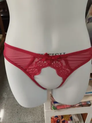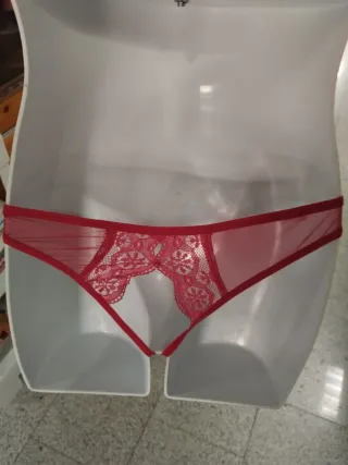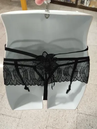 Este tanga es una pieza delicada y seductora. - Diseño abierto. - Detalle de encaje con forma de mariposa en la parte delantera. - Tira fina. - Tejido con un ligero brillo.
