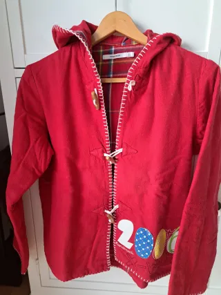 Chaqueta de pijama roja con capucha y cierre de cordones. - Diseño con pespuntes blancos. - Detalle de apliques con números 200 y estrellas. - Forro interior a cuadros.
