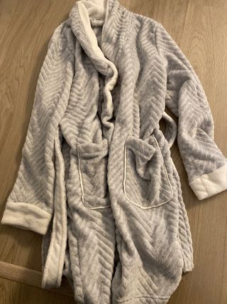 Bata de casa suave y cómoda, perfecta para estar en casa. - Diseño con textura de espiga. - Cuello y puños blancos. - Incluye cinturón para ajustar.