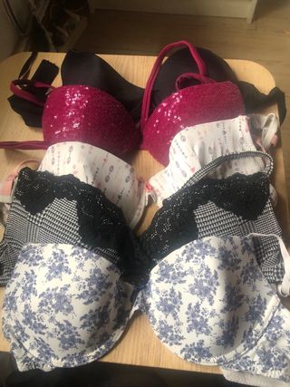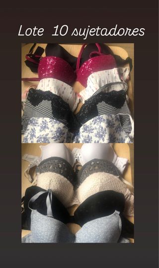 Lote de diez sujetadores en talla S (80B). Incluye variedad de estilos y diseños. - Diseños con lentejuelas. - Estampados florales. - Tejido de encaje. - Patrón de cuadros. - Estampado de leopardo. - Diseño de lunares. Con aro y relleno Tengo otro lote sin aros y sin relleno