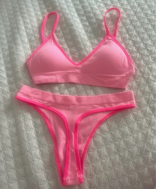 Conjunto de lencería de dos piezas en color rosa. - Sujetador de tirantes finos. - Braguita tipo tanga. - Ribete en contraste de color fucsia.