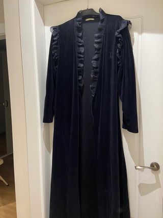 Elegante bata larga de terciopelo con detalles de volantes. - Material: Terciopelo. - Color: Negro. - Diseño: Largo con volantes en el cuello y mangas.