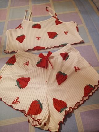Pijama de mujer nuevo, a estrenar. Es un conjunto de dos piezas: top y pantalón corto. - Diseño de fresas rojas sobre fondo blanco. - Top con tirantes finos. - Pantalón corto con lazo. - Tejido suave y agradable al tacto.