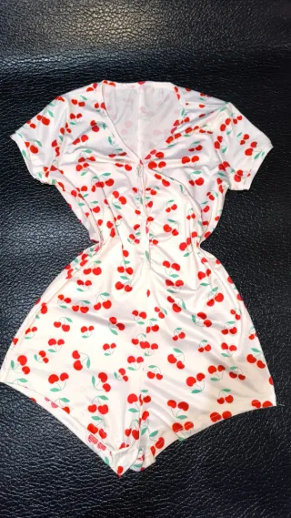 Conjunto de pijama corto con estampado de cerezas. Es una prenda cómoda y fresca. - Diseño con botones en la parte delantera. - Mangas cortas. - Estampado de cerezas rojas sobre fondo blanco.