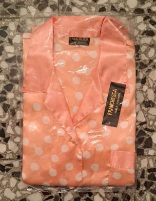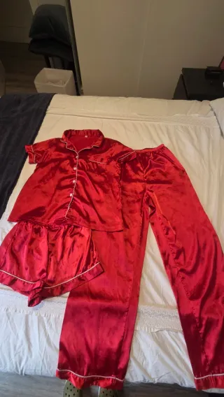 Pijama satinado sin estrenar, conserva la etiqueta del pantalón. La camisa es una talla XL y el pantalón es una talla XXL. Tiene un detalle de encaje en los hombros.