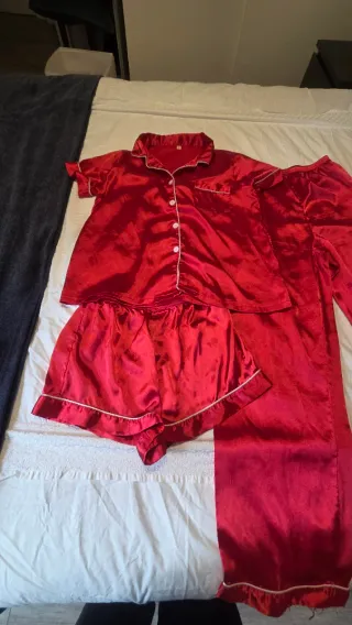 Conjunto de pijama de satén con un diseño elegante. Las dos 14 euros - Incluye camiseta de manga corta y pantalón largo. - También incluye pantalón corto. - Acabado satinado brillante.