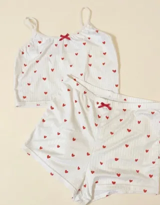 Conjunto de pijama corto con un diseño encantador. - Camiseta de tirantes con estampado de corazones. - Pantalón corto a juego. - Detalle de lazo rojo en ambas prendas.