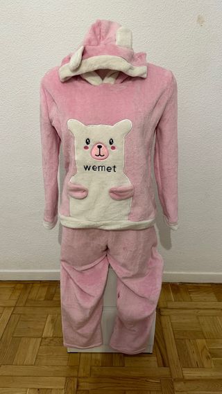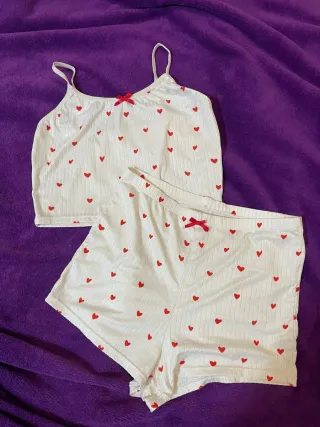 Conjunto de pijama de tejido suave con estampado de corazones,es de la tienda Tramas , está en buen estado ,tiene una micro mancha que es de pintauñas, apenas se ve , entrega en mano o envío por wallapop