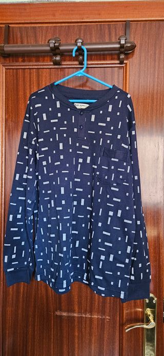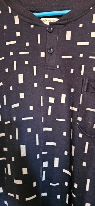 Camiseta de pijama con un diseño original. Vale para talla S. - Manga larga. - Cuello redondo con botones. - Bolsillo en el pecho. - Estampado de rectángulos y cuadrados blancos.