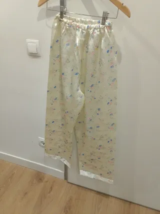 Pantalón de pijama de raso blanco con un delicado estampado floral. - Tejido suave y ligero. - Estampado de flores en tonos rosas y azules. - Detalle de encaje en los bajos.