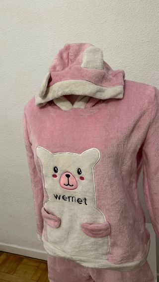 Conjunto de pijama de tacto suave con un adorable diseño de oso. - Incluye sudadera con capucha y pantalón. - Detalle de orejas en la capucha. - Estampado de oso con bolsillo. - Material cálido y confortable.