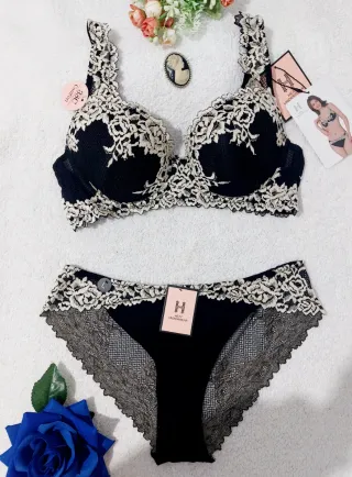 Precioso conjunto de lencería de encaje stretch en negro, sujetador con aros y relleno para realzar el busto ⚘️ Tirantes ajustables Sexy, lovely, muy bonito - Sujetador 100C. - Braga talla XL - Diseño delicado con detalles de encaje.