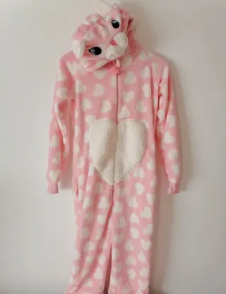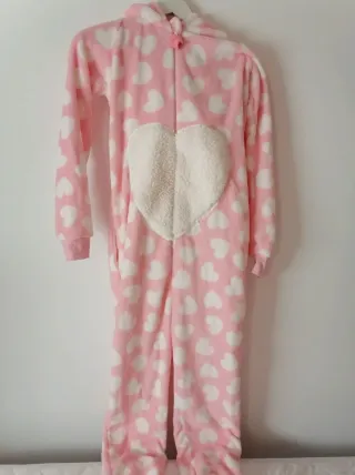 Pijama de cuerpo entero con diseño de corazones. - Estampado de corazones blancos sobre fondo rosa. - Detalle de corazón blanco en el pecho. - Capucha con orejas y detalles de cara de animal. - Cierre frontal con cremallera. Talla S, nuevo sin estrenar.