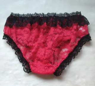 Braguitas de color rojo con detalles de encaje negro. - Ribete de encaje negro en la cintura. - Encaje negro en los laterales de las piernas.