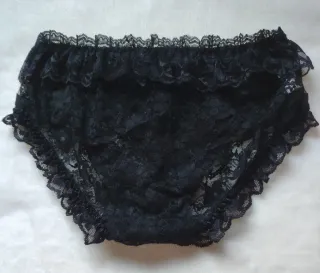 Braguitas de encaje negro con un coqueto lazo decorativo en la parte delantera. El diseño es delicado y femenino. - Tejido de encaje floral. - Detalle de lazo satinado. - Cintura elástica con volantes.