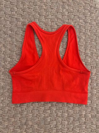 Sujetador deportivo de la marca Prozis en color rojo. Diseñado para ofrecer comodidad y soporte. - Tejido elástico y transpirable. - Diseño con corte en la parte frontal. - Tirantes tipo racerback para mayor libertad de movimiento.
