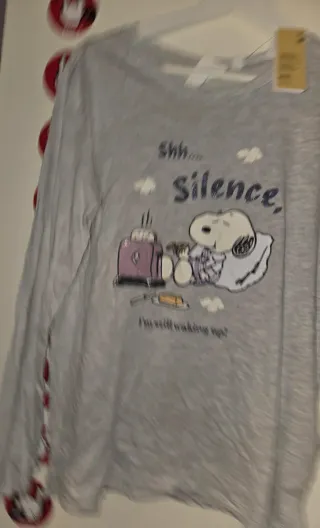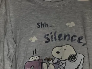 Pijama de mujer con estampado de Snoopy. - Diseño con texto Shh... Silence. - Detalle de nubes y tostadora. - Personaje Snoopy con galleta y manta. - Nuevo, con etiquetas. - Material: 98% Algodón 2% viscosa
