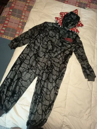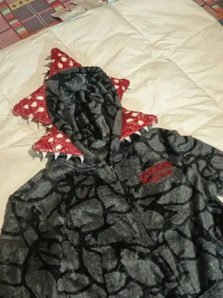 Pijama infantil con diseño inspirado en Stranger Things. Es un mono completo con capucha. - Tejido suave y cálido. - Cierre de cremallera frontal. - Capucha con detalles de dientes y pétalos. - Estampado de piedra y logo de la serie.