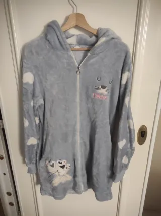 Bata de mujer suave y cómoda, perfecta para estar en casa. Presenta un diseño encantador con un gatito y nubes. - Estampado de nubes blancas. - Detalle de gatito en la parte delantera. - Cierre de cremallera. - Capucha integrada.