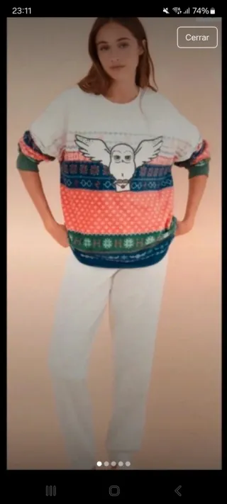 Conjunto de pijama con diseño inspirado en Harry Potter. La parte superior es blanca con un estampado de un búho y detalles de colores. - Parte superior con estampado de búho. - Diseño de rayas multicolor en la parte inferior de la prenda superior. - Pantalón gris. - Manga larga.