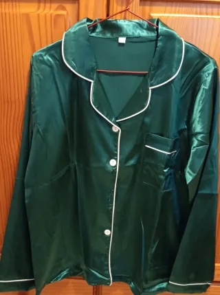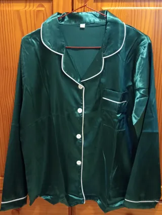Pijama de satén en un bonito tono verde esmeralda. Perfecto para estar cómodo en casa. Tengo también la talla L. - Tejido satinado brillante. - Cuello solapa con ribete blanco. - Cierre de botones. - Bolsillo en el pecho.