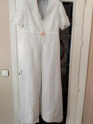 Elegante conjunto de camisón y bata de encaje blanco, ideal para novias. - Bata larga con mangas cortas de encaje. - Camisón a juego. - Detalle de flor rosa en la cintura de la bata.