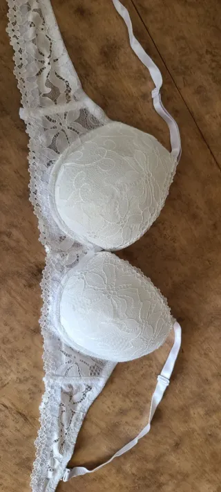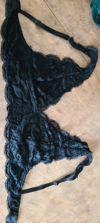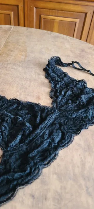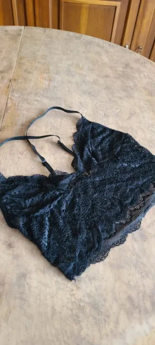 Este sujetador lencero es una pieza delicada y elegante. - Diseño de encaje intrincado. - Tirantes ajustables e intercambiables. - Usado una vez. - Sin aro.