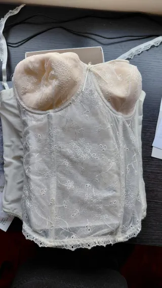 Preciosa pieza de lencería. Es un corset blanco de encaje, delicado y elegante.,lleva sujetaligueros,una preciosidad - Talla85B, sin estrenar - Diseño con copas integradas.y espalda concorchetes y licra para mejos ajuste. - Acabados en encaje floral.