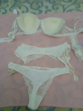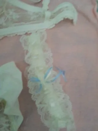 Conjunto de lencería delicado, ideal para novias. Liga ,con lacito azul ,como manda la tradición - Sujetador con aros y copas,talla95B - Tanga con detalles de encaje.tallaG - Ligero portaligas a juego.tallaG,sin estrenar y en su caja original ,una preciosidad