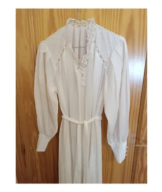 Elegante bata de novia en color blanco. Perfecta para el día de la boda o para estar cómoda en casa. - Diseño con cuello alto y detalles de encaje. - Cinturón a juego para ajustar la cintura. - Mangas largas abullonadas con puños abotonados.