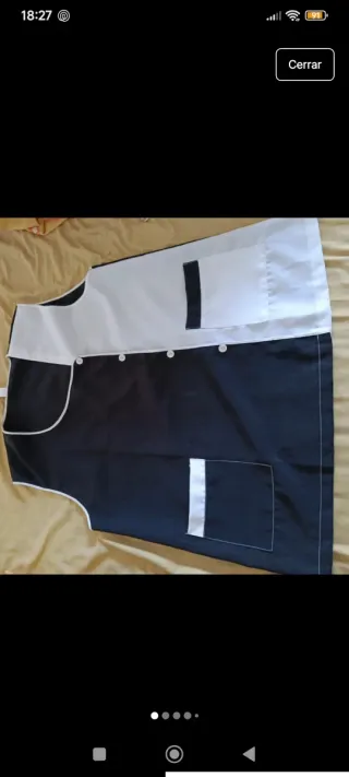 Bata de trabajo de dos tonos, ideal para el día a día. Solo tiene una pinta de tinte en el cuello, la use solo un día para teñirme pero la frote con productos y se quitó, solo quedó una pintina - Diseño con cuello blanco. - Cierre de botones. - Bolsillo frontal con detalle blanco.
